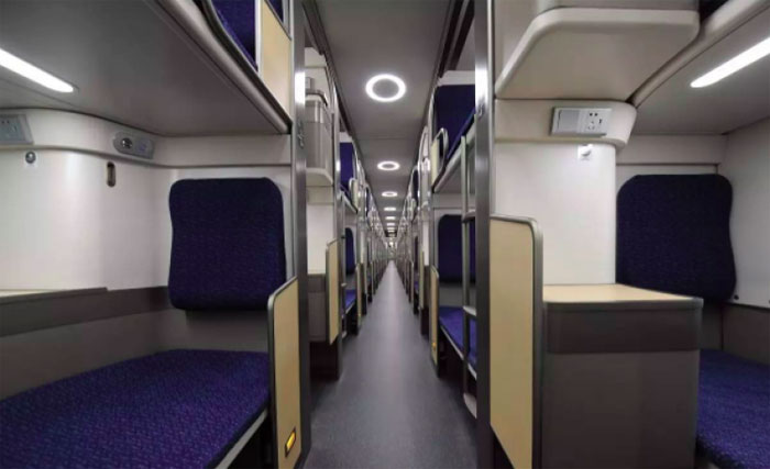 縱向臥鋪動(dòng)車組采用16節(jié)編組,全列軟臥,運(yùn)營時(shí)速250公里,總定員880人。該臥鋪動(dòng)車組采用全新設(shè)計(jì),車廂中間為中央通道,兩側(cè)設(shè)置雙層臥鋪,鋪位采用縱向布置,即與列車的運(yùn)行方向平行。也就是說,再也不用“橫”著睡啦!
